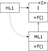 소스 코드에서 HL1 모듈은 인터페이스(런타임에는 존재하지 않음)를 통해 F() 를 호출