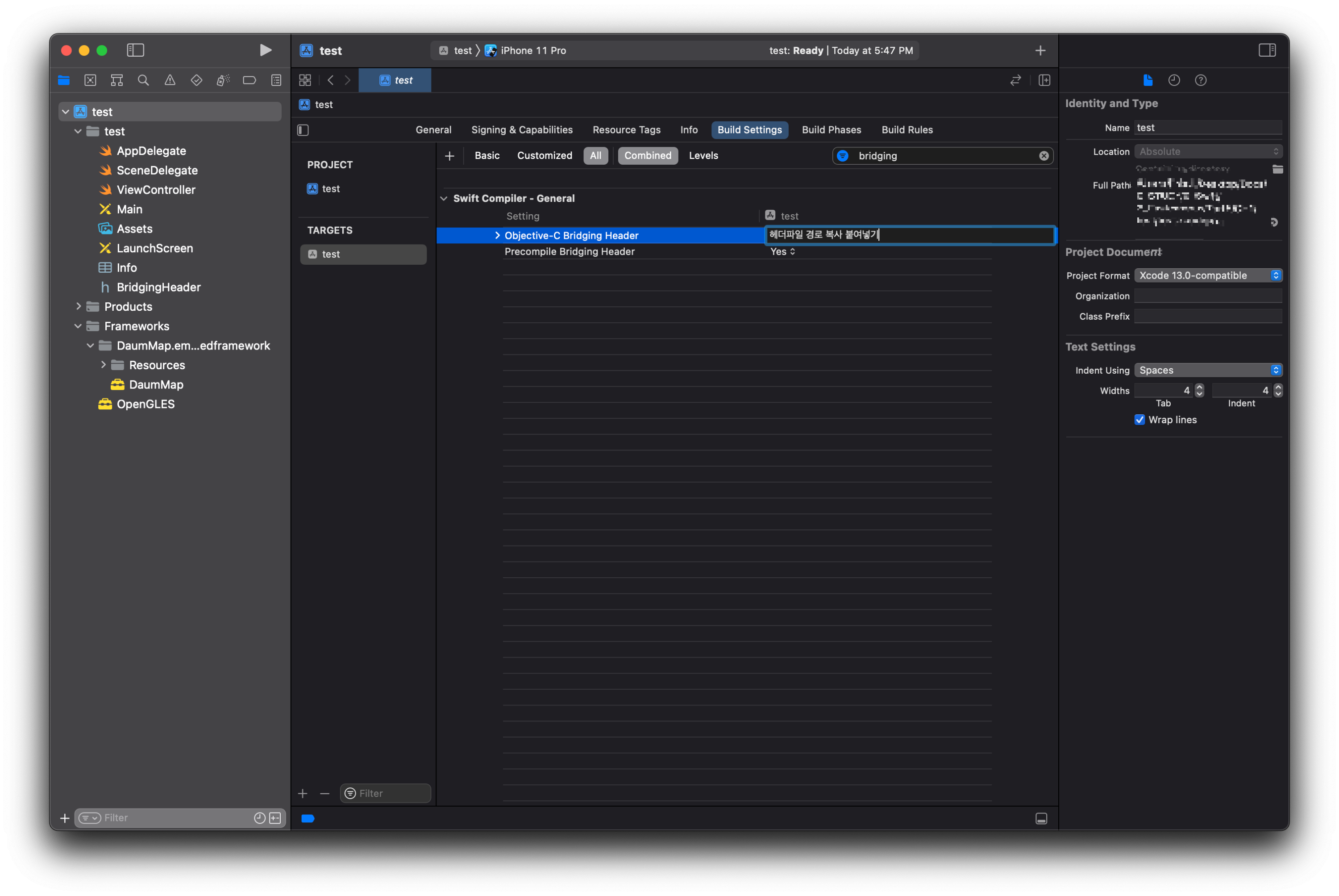 추가한 헤더 파일의 경로를 복사한 뒤 → Target → Build Settings → Objective-C Bridging Header 에 붙여넣기