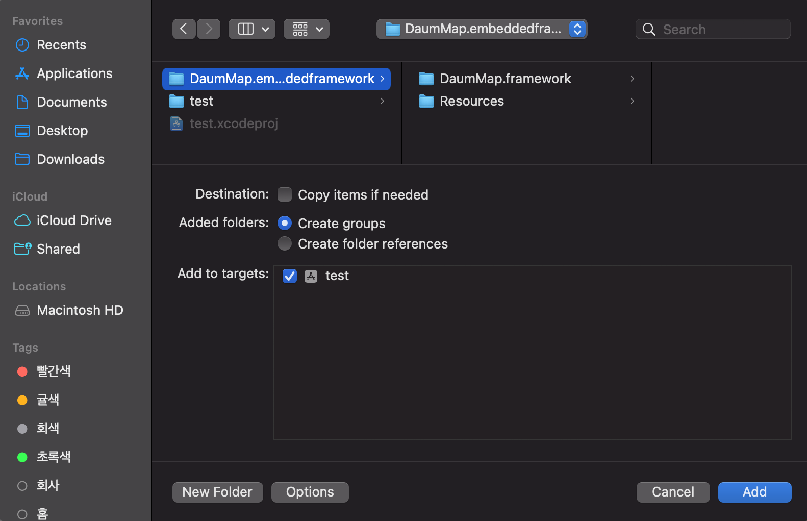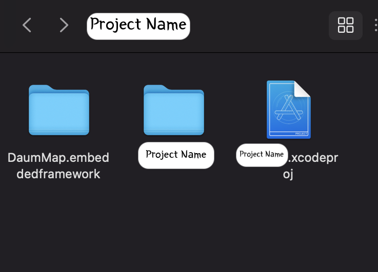 4. SDK 를 다운받고 (위 Kakao Map iOS API 가이드 링크 참고) 압축을 풀어서 lib/DaumMap.embeddedframework 폴더를 애플리케이션 프로젝트로 복사하기