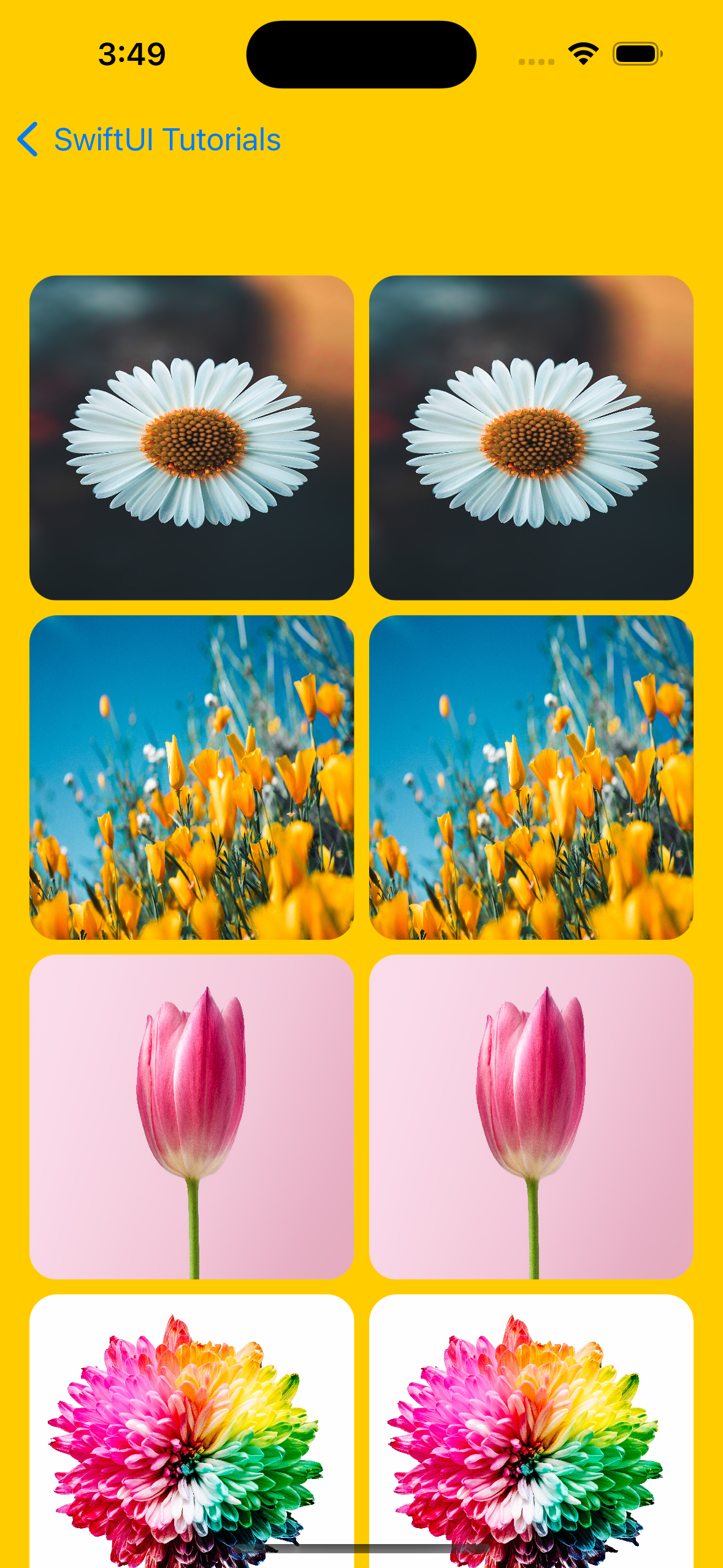 6장의 이미지를 준비하여 asset에 추가해 둔 뒤 한 행에 하나의 이미지를 column의 개수만큼 보여지도록 구현하였다.